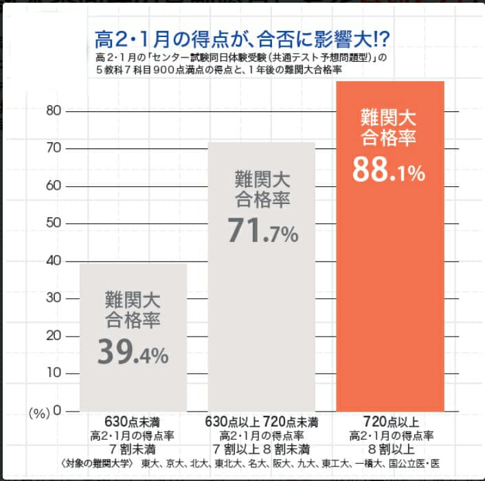 「新高3生」の場合に、特に意識したいのが、高2・1月の得点です。本番1年前に先輩が受ける共通テストと同じ問題を解いて、どのくらい取れるかが、1年後の合否に大きく影響します。1年前に7割得点出来ていると、合格率も7割を超えます。さらに、得点率が8割を超えると、難関大合格率がぐんと高まります。共通テスト同日体験受験に挑戦して、志望校現役合格のための一歩を踏み出しましょう。